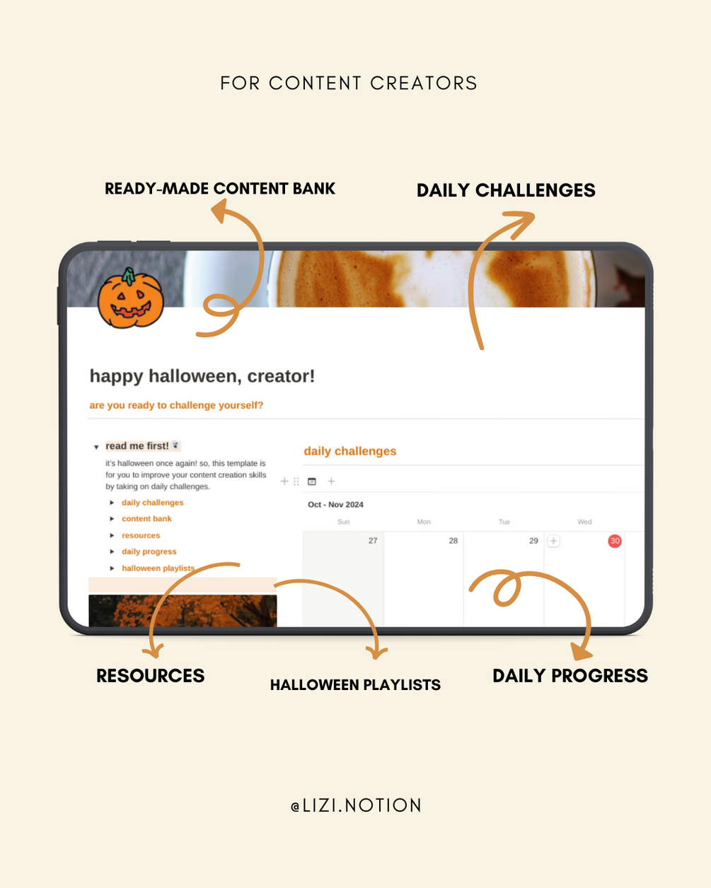 As a content creator, you're always looking for fresh ideas to keep your audience engaged. 7-Day Halloween Challenge is the perfect solution! With daily challenges, progress tracking, a content bank, resource storage, and Halloween playlists, you'll have everything you need to create captivating content that will haunt your followers.